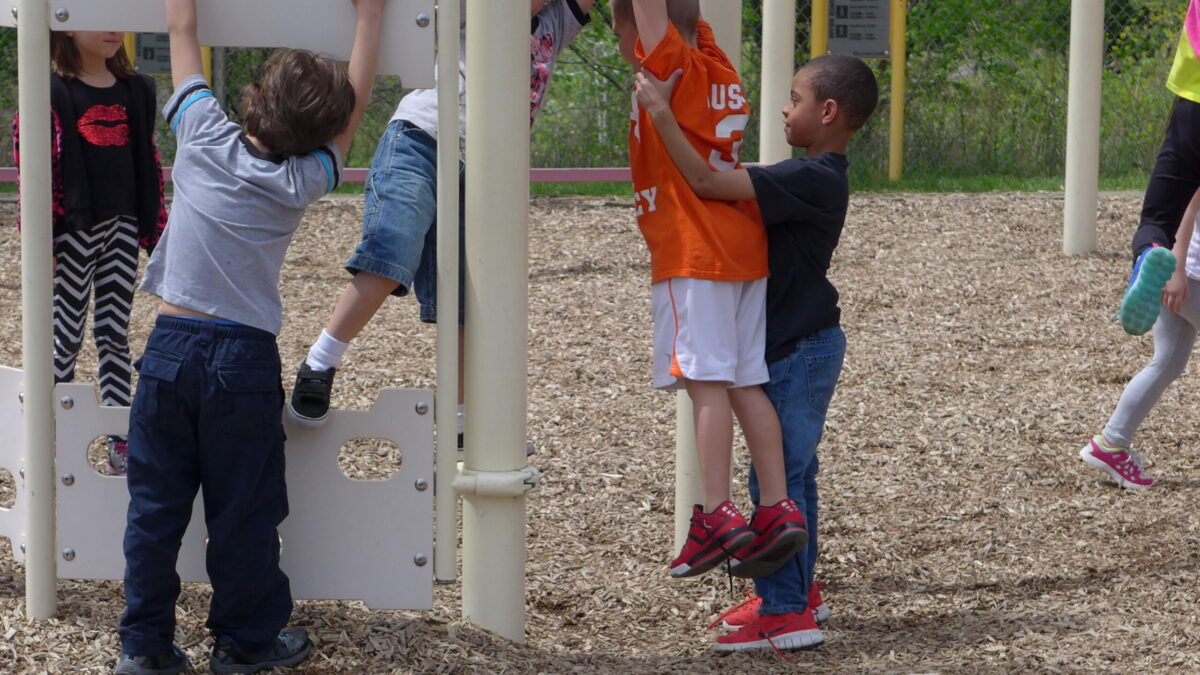 Giovanni, Cambria, Lily, and Jermaine on the Monkey Bars and Exercise Equipment