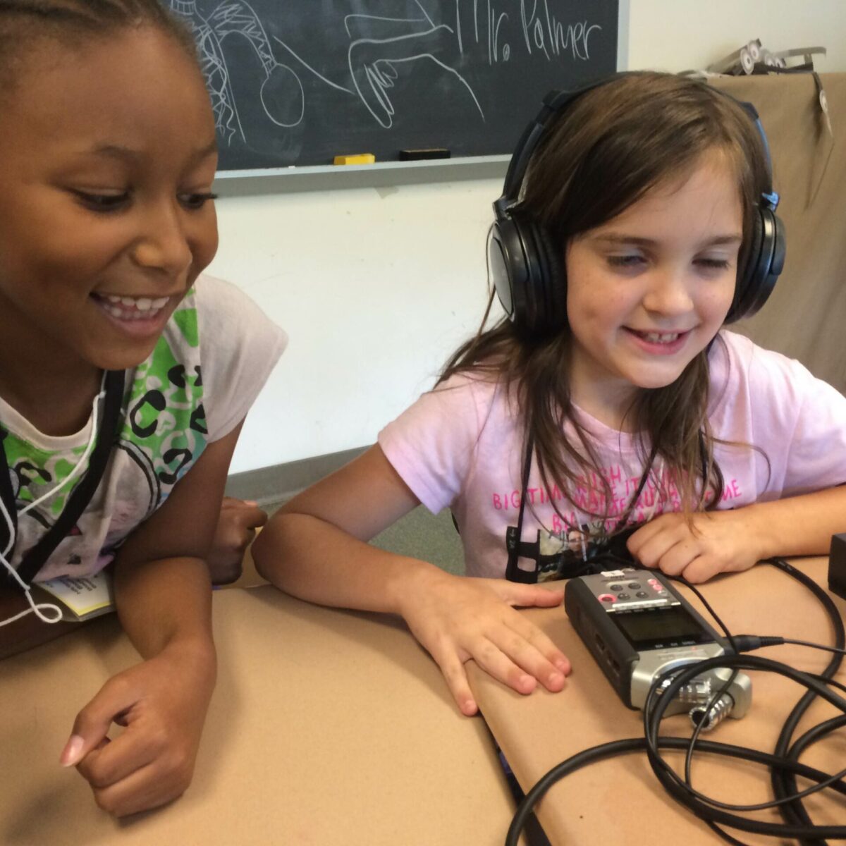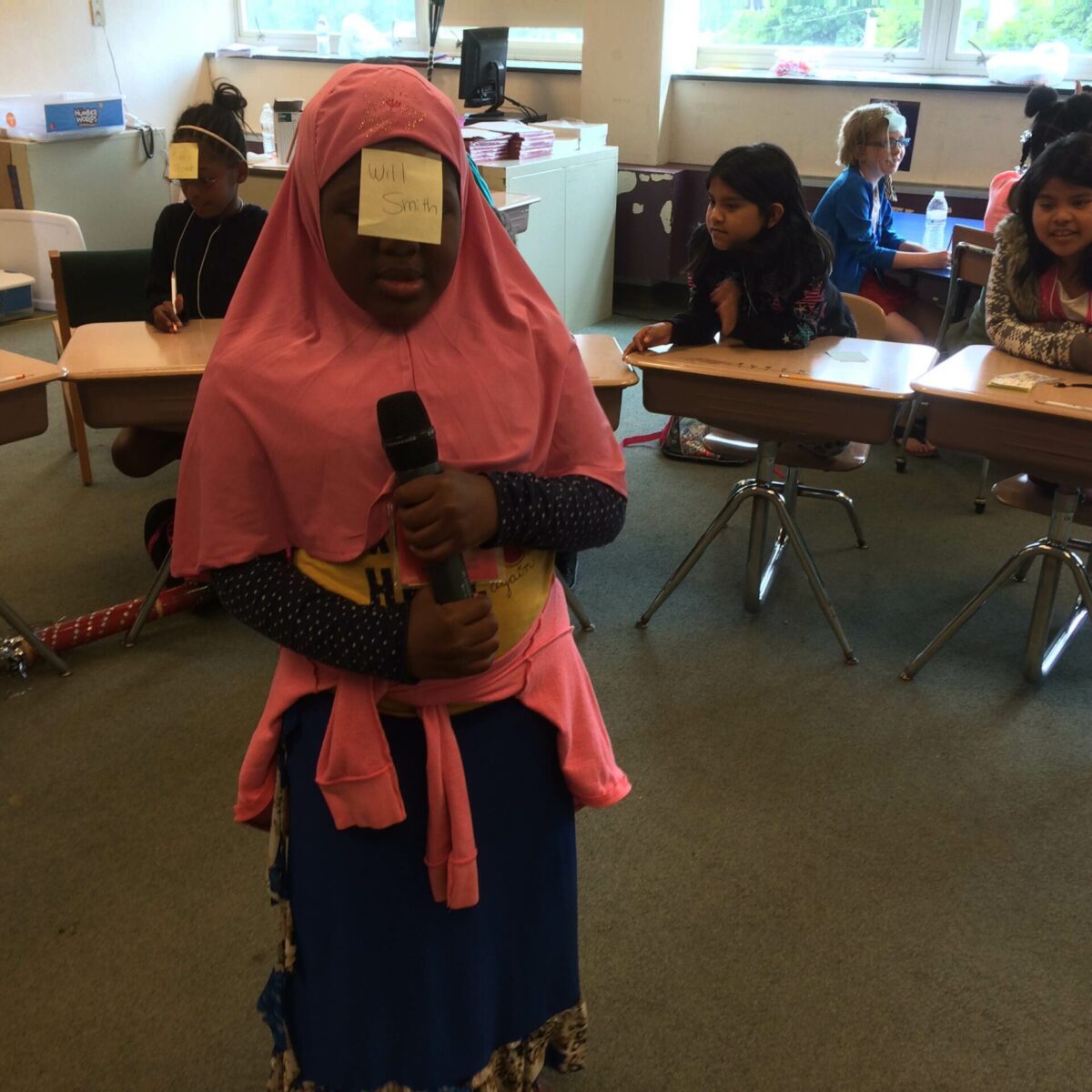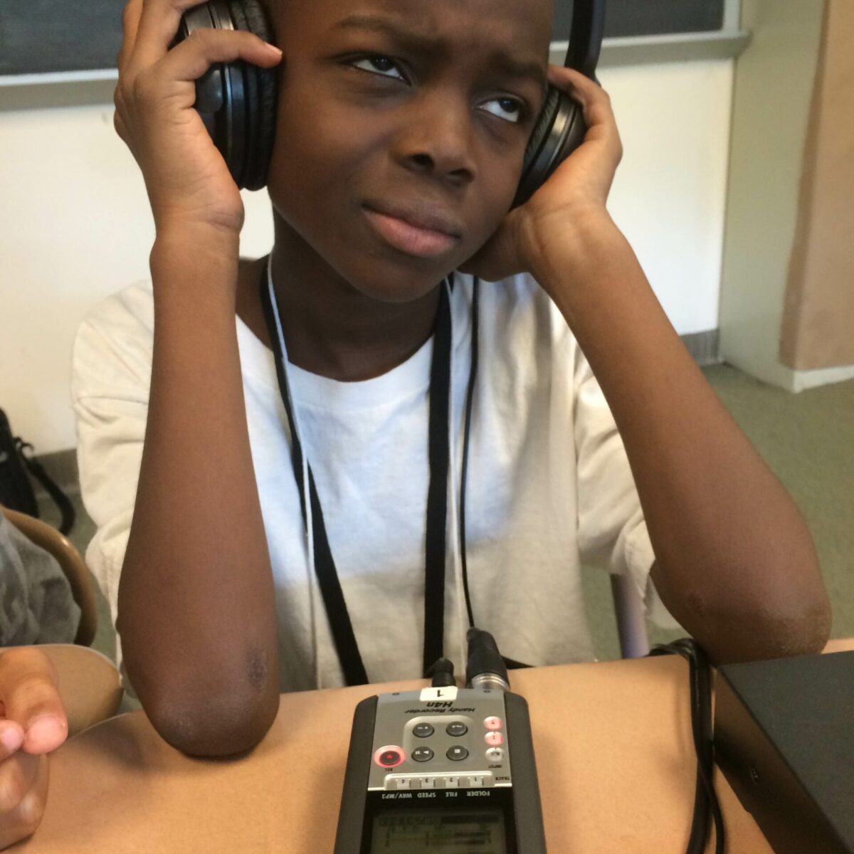 After writing and recording, we then had time to brush up on our microphone technique and play the “Who Am I?” game. Students each received a sticky note, wrote down the name of a famous person, then stuck said note to a neighbor’s forehead. Each camper then got a chance to use a wireless mic and ask Yes or No questions in an attempt to figure out who they were, all while having to exhibit perfect mic technique.