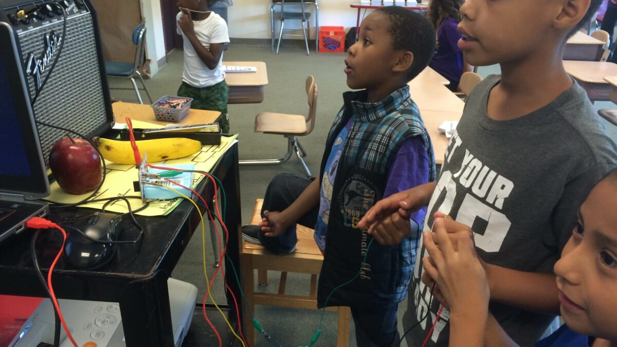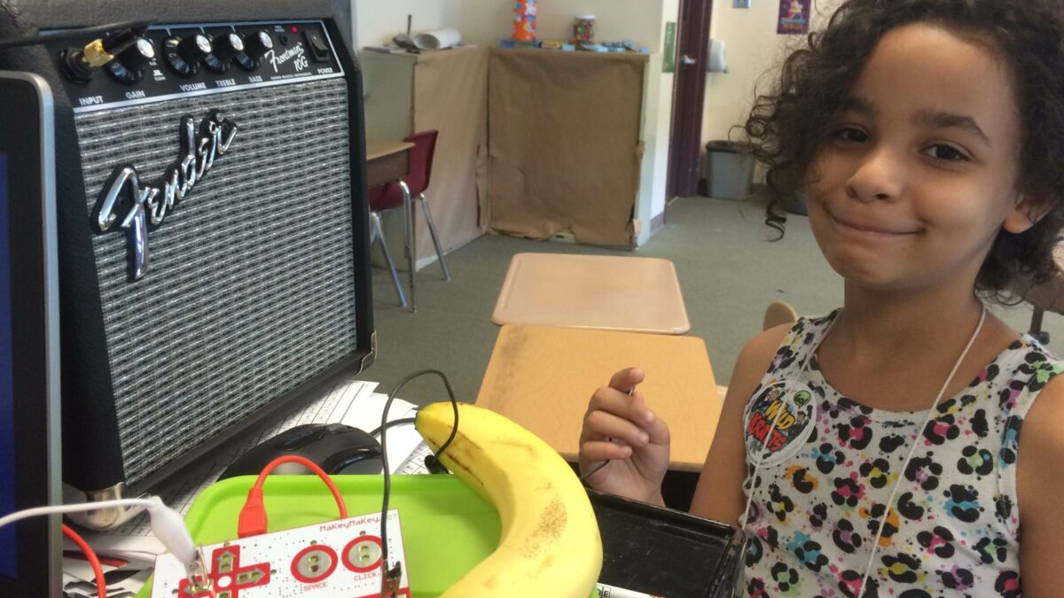 After having to make some educated guesses about electricity, campers not only got to learn about electrons, circuits and conductivity, they experienced these things first hand thanks to the “Makey Makey,” an invention kit created by JoyLabz LLC that turns everyday objects into buttons for computers. From becoming a human piano to playing Pong on oranges, students experimented with basic circuit building.