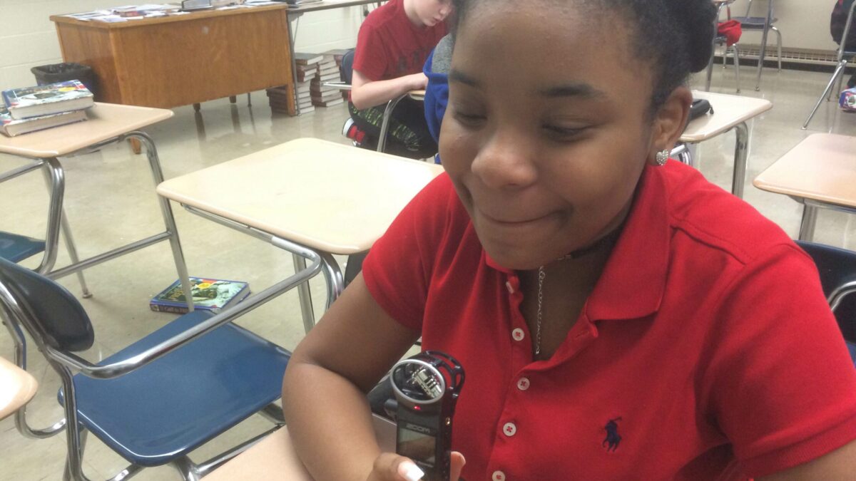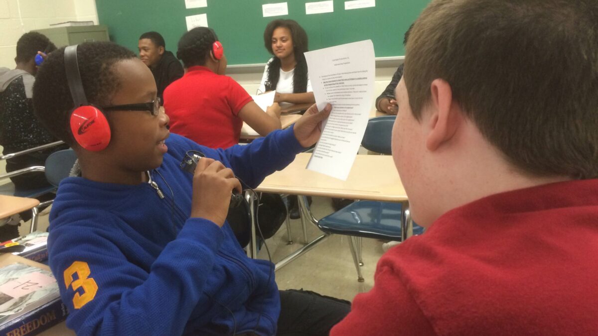 Students were introduced to the basics of interviewing as well as the H1, a handheld digital recorder. After forming groups of two, they took turns operating the equipment and asking insightful questions of their classmates.