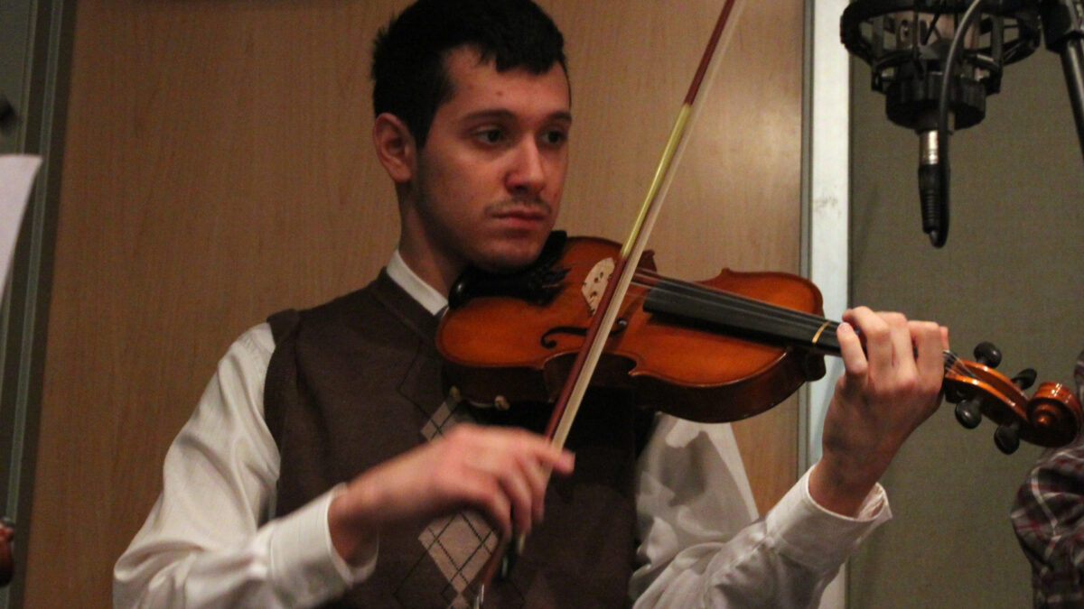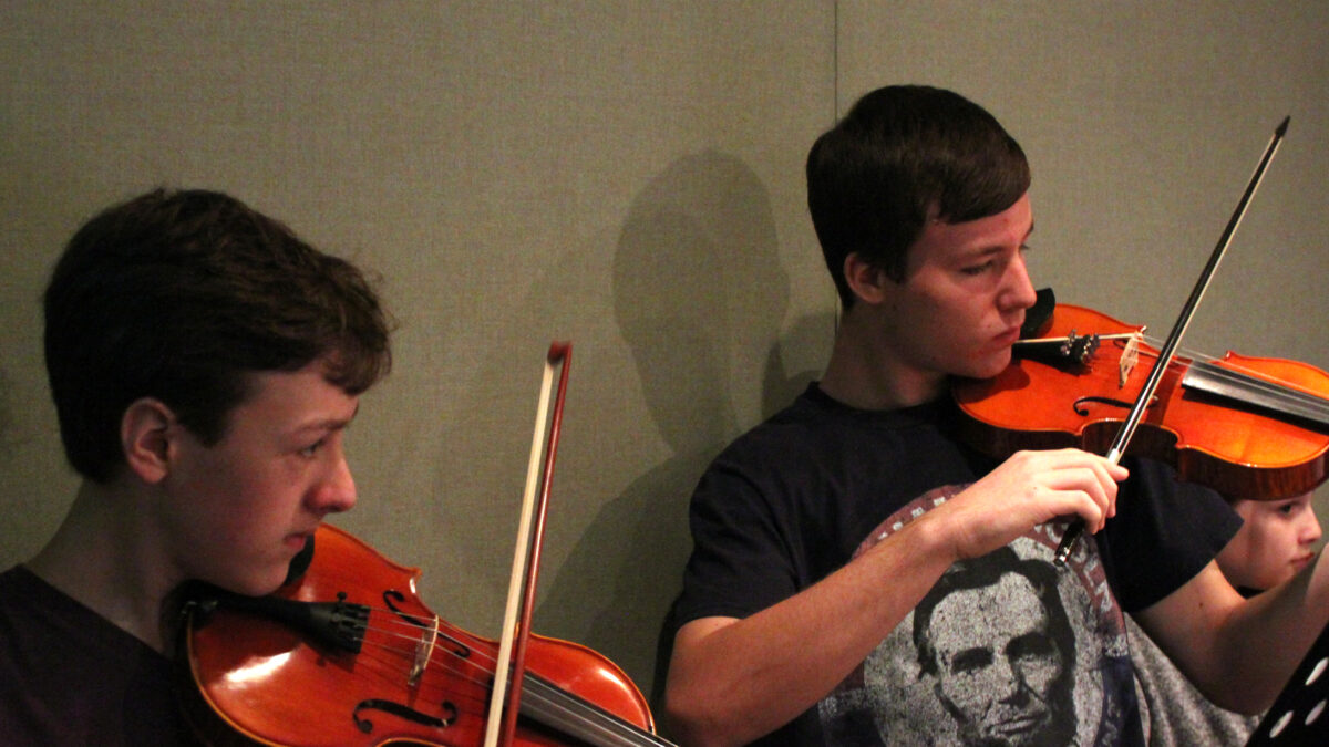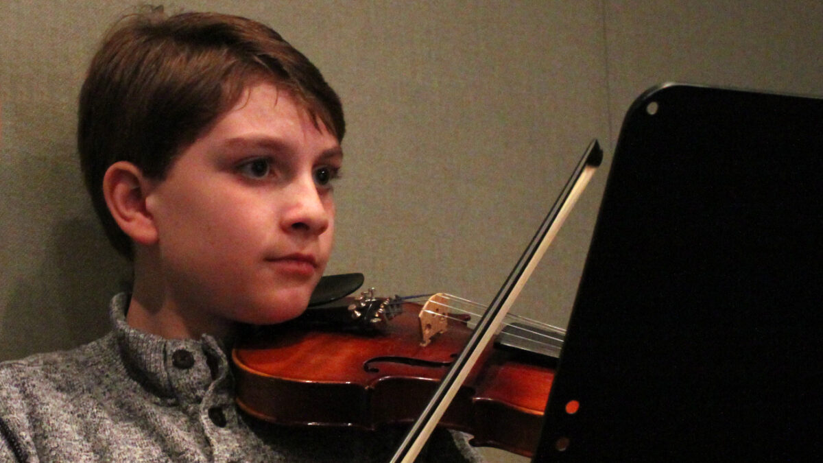 From 12/02/2017: Young violinists Jason Assaf (21), Evan Koepfinger (14, Achievement House Cyber Charter School), Yanna Mavrogeorgis (10, Brookline Elementary), Rocco Tobul (10, Banksville Elementary) and Ethan von Hedemann (15, Keystone Oaks) from Seton Center School of Music with instructor John Ott.
